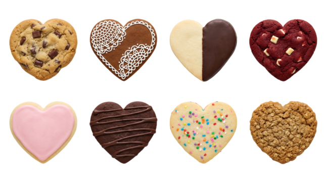 Heart shaped cookie set including chocolate chip, gingerbread, dipped shortbread, red velvet, and iced sugar cookies isolated. Valentines day and bakery dessert collection.