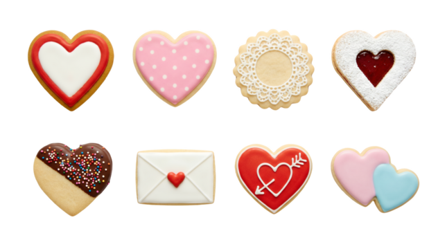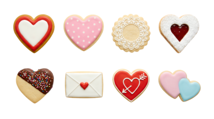 Valentine's day cookie set including heart, envelope, and lace shapes decorated with royal icing and sprinkles isolated. Sweet bakery and holiday dessert collection.
