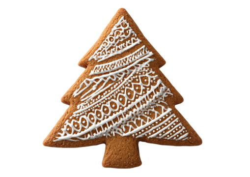 A beautifully decorated gingerbread christmas tree cookie isolated on transparent background, showcasing intricate icing details and festive holiday cheer