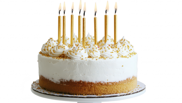 A beautifully decorated birthday cake with white frosting and golden sprinkles. topped with nine lit candles. set against a minimalist background. perfect for celebration themes