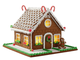 A beautifully decorated gingerbread house with candy canes on transparent background