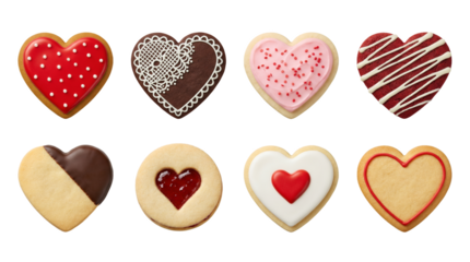 Heart shaped cookies set including decorated gingerbread, jam filled linzer, iced sugar, and red velvet varieties. Valentine Day and romantic dessert collection.
