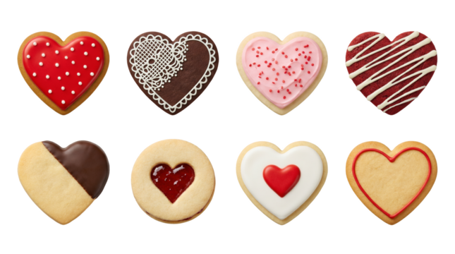 A collection of heart-shaped cookies decorated with red icing and white details on a white background Isolated on a white background