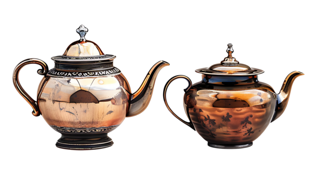 Three different designs of ceramic jugs decorated with intricate patterns, isolated on a transparent background