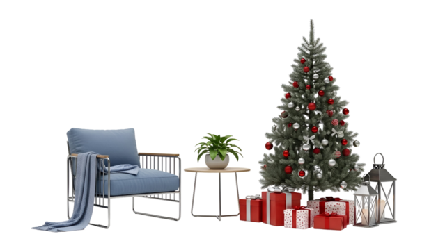 Decorated christmas tree with ornaments and lights, PNG style, transparent background for festive holiday designs