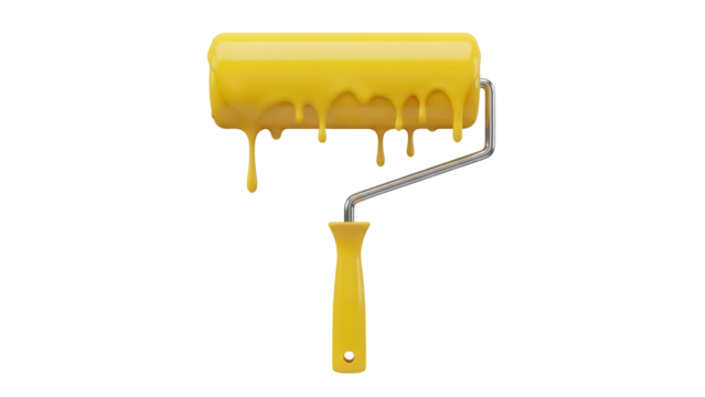 Yellow paint roller with dripping paint isolated PNG, painting tool for home improvement and renovation projects on transparent background
