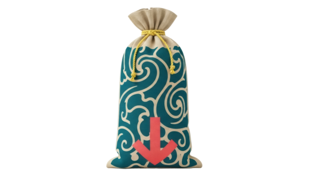 Isolated ornamental brown sack with red arrow downward, natural light effect, design element