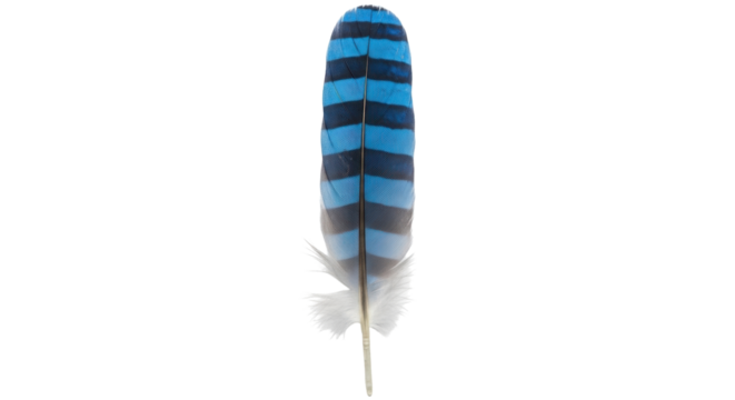 Isolated blue jay feather with black bars and a wispy stem for crafts or collection