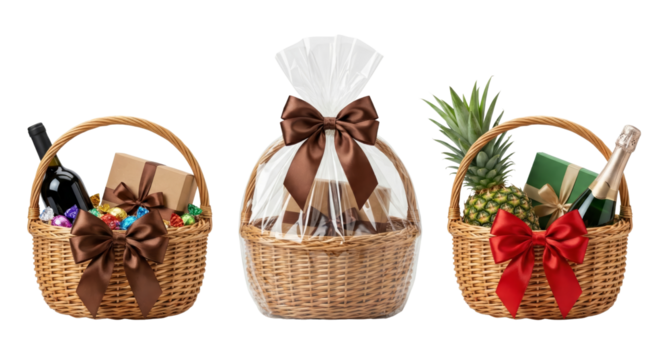 Elegant gift baskets with festive wrapping and decorative bows isolated on transparent background