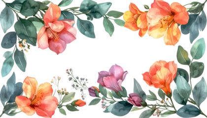 Watercolor floral frame featuring blossoms, foliage, and blank space for text