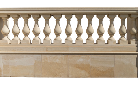 Close-up of ornate balustrade with cream-colored pillars and sandstone brick base