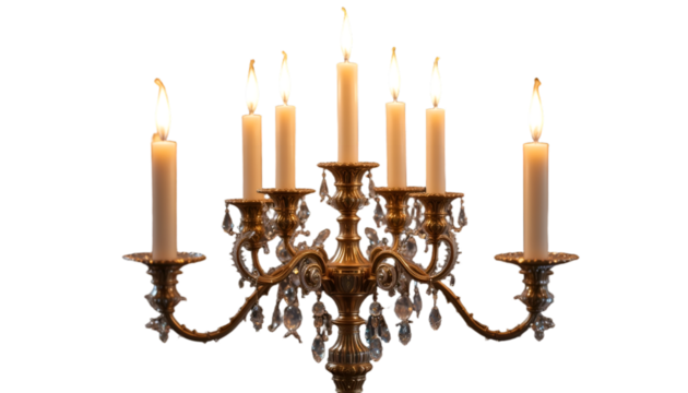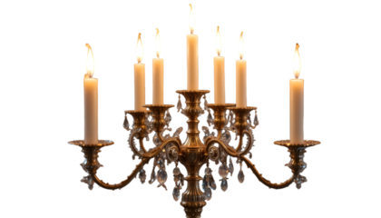 A row of candles with flames burning brightly, placed next to each other on a transparent background