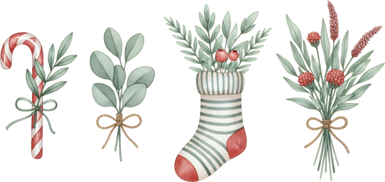 Watercolor festive arrangement featuring a striped Christmas stocking with greenery and berries a candy cane with foliage and two floral bouquets tied with twine