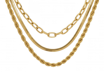 Golden and silver maple leaf ornaments and chains on transparent background.