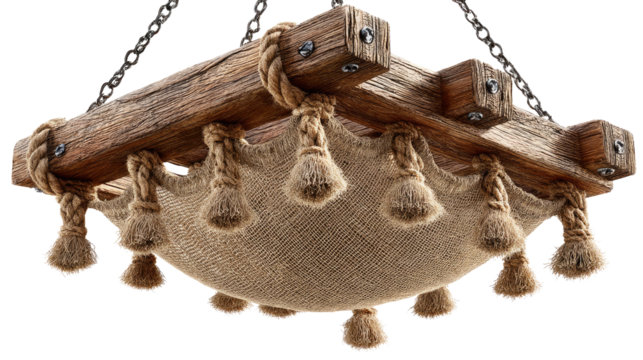 Rustic Chandelier: A close-up shot of an antique wooden chandelier with a classic design, suspended from chains, with intricately woven rope and decorative tassels.