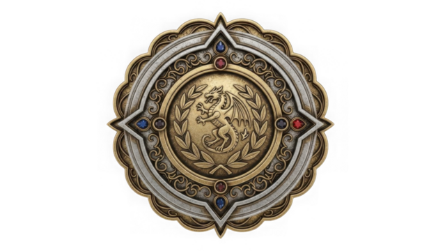 A shiny golden wax seal with a smooth circular center and scalloped edges in a classic design.