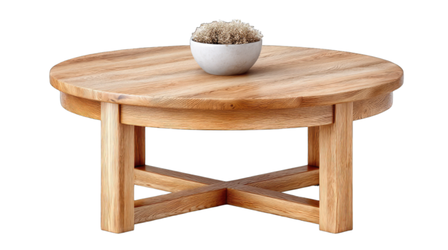 A Rustic Round Wooden Coffee Table with a Bowl of Toppings on a Transparent Background