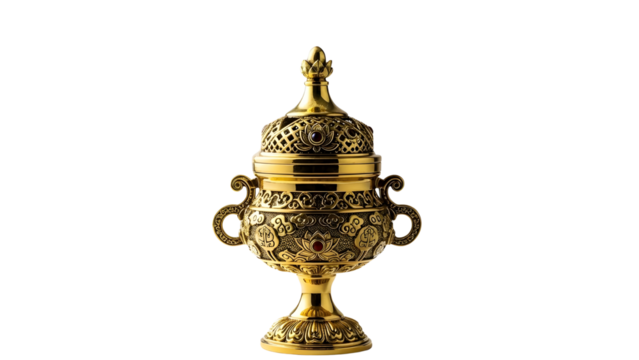 Ornate golden censer or thurible for religious rituals and traditional Christian ceremonies isolated PNG with Transparent Background