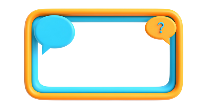 3D-rendered rectangular frame, with two speech bubbles, one with a question mark