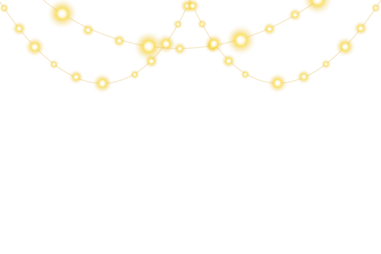 Transparent Christmas garland PNG with glowing yellow bulbs, shimmering sparkles, and bright decorative illumination suitable for invitations, party flyers, winter greeting cards, and festive design e
