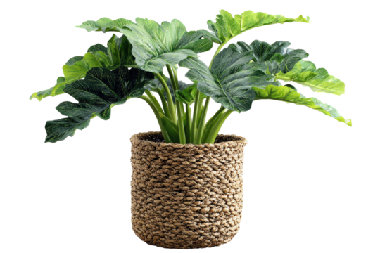 Lush green Alocasia elephant ear plant in a woven basket pot.