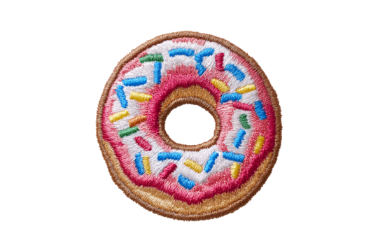 Donut embroidery patch isolated on transparent background, in PNG format, cut out