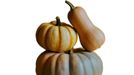 Photo of three decorative gourds isolated on white or transparent background, Fall of Thanksgiving decor, png