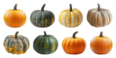 Assorted autumn pumpkins and gourds with colorful leaves and acorns scattered around them isolated on transparent background