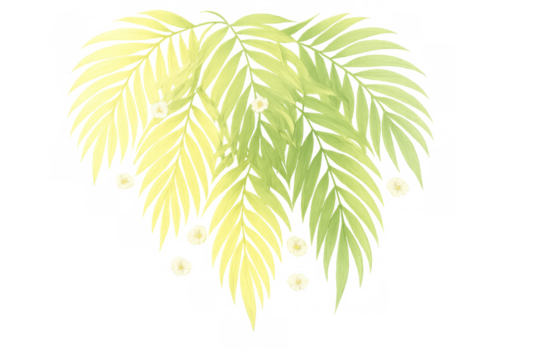 Green palm leaves and white tropical flowers creating a natural decorative border on transparent background