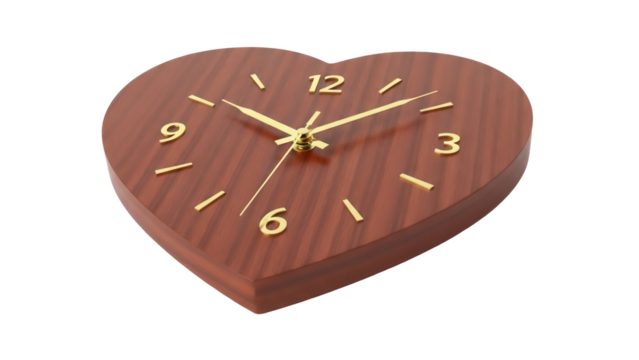 Heart-shaped wooden clock with golden hands and numbers isolated PNG, decorative timepiece on transparent background for design projects