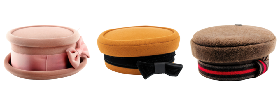 Collection of stylish wide-brimmed hats in various colors and designs isolated on transparent