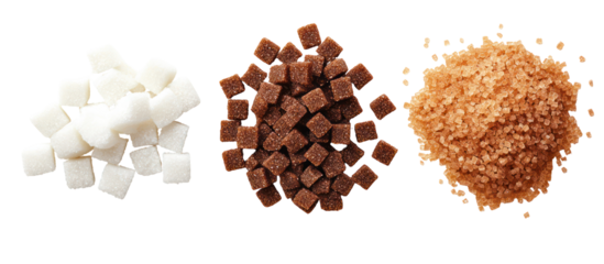 Three Piles of Sugar, White and Brown, in Cube, Diamond, and Hexagon Shapes on Transparent Background