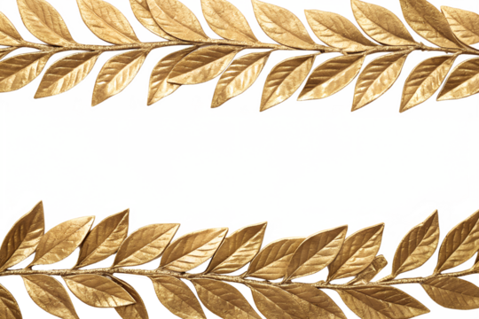 Golden laurel leaves arranged in a symmetrical pattern on a transparent background. The leaves are detailed and vibrant, showcasing a rich golden color.