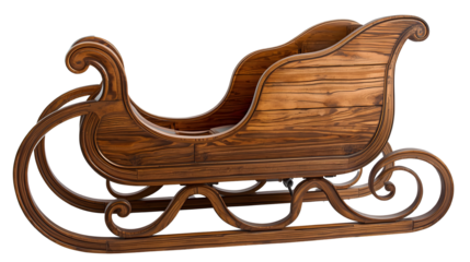 Traditional wooden sleigh with ornate scrollwork on a plain background