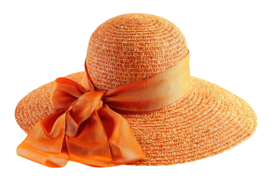 A straw sun hat with a decorative ribbon and flower, isolated on a transparent background