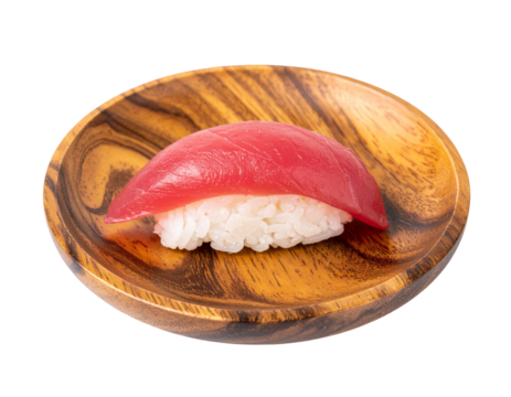 A single piece of nigiri sushi on a decorative wooden bowl, isolated
