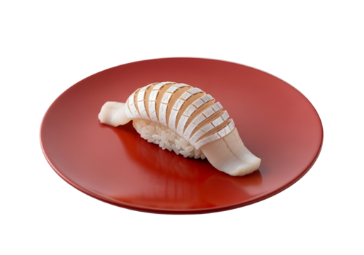 A visually striking squid sushi piece sits artfully on a polished red plate, showcasing intricate cuts and a delicate presentation.