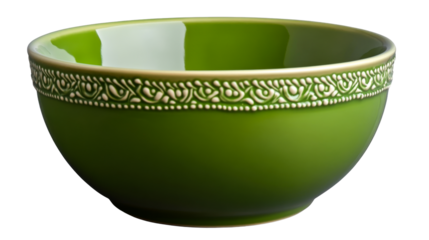 Elegant green bowl with decorative rim, food container, cut out transparent