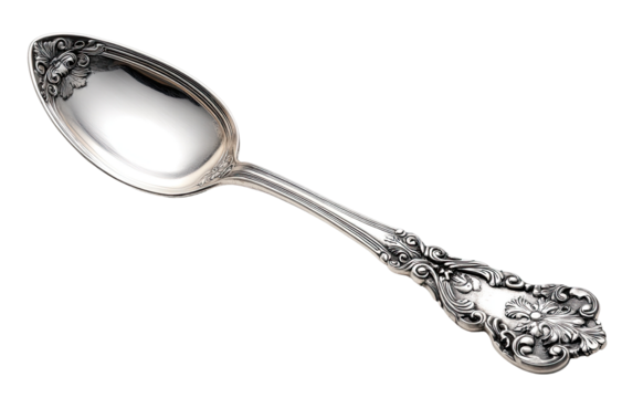 A shiny silver spoon with ornate detailing lying diagonally on a plain black background studio shot