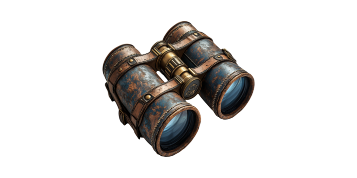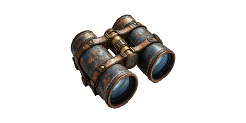 Vintage Steampunk Binoculars With Leather And Brass Detailing. Retro Exploration And Adventure Theme Isolated On Transparent Background
