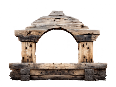 Rustic weathered wooden garden bridge isolated on transparent background.