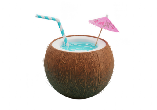 Refreshing tropical coconut drink with blue liquid and decorative umbrella isolated on transparent background