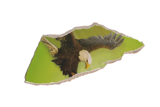 Torn paper collage element of a flying Bald Eagle. Vintage illustration scrap for scrapbooking. Isolated design asset with a transparent background.