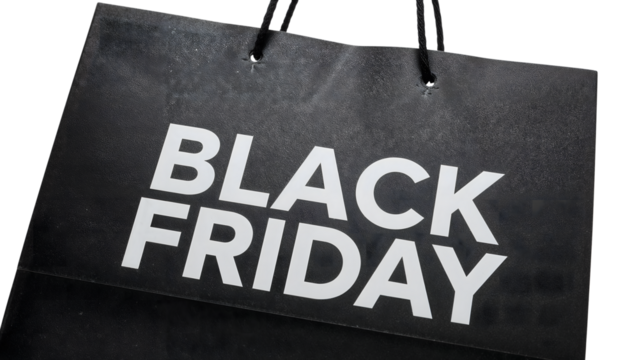 Bold black friday shopping bag with white lettering for seasonal sales and promotions