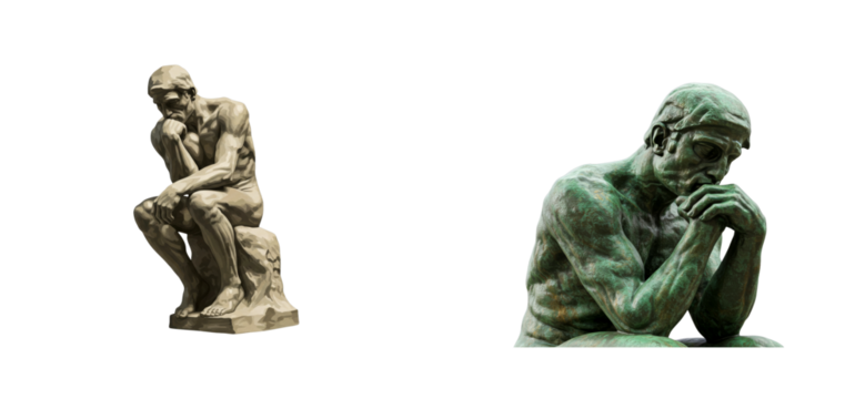 Two classical statues of a pensive man in a thoughtful pose, one made of stone and one of bronze with a green patina, representing deep contemplation and philosophy