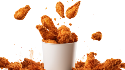 A bucket of fried chicken tenders with some floating isolated on transparent background