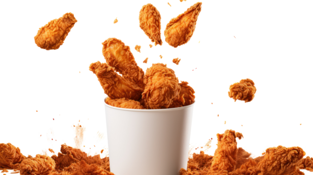 Fried chicken flying out of paper bucket isolated on transparent and white background.PNG image.