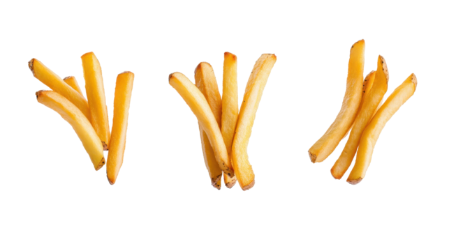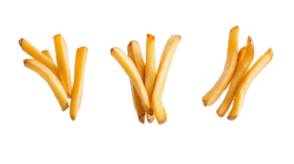 Three servings of crispy golden French fries arranged on a white background. transparent background