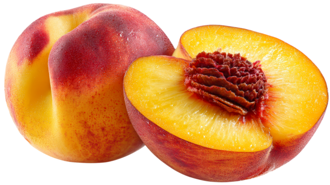 Juicy ripe peach and half of a fresh peach with glistening water droplets revealing vibrant yellow flesh and deep red skin perfect for summer refreshment and healthy eating.