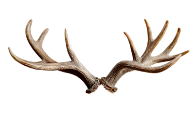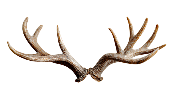Two symmetrical deer antlers, light gray/brown color, detailed texture, isolated on black background